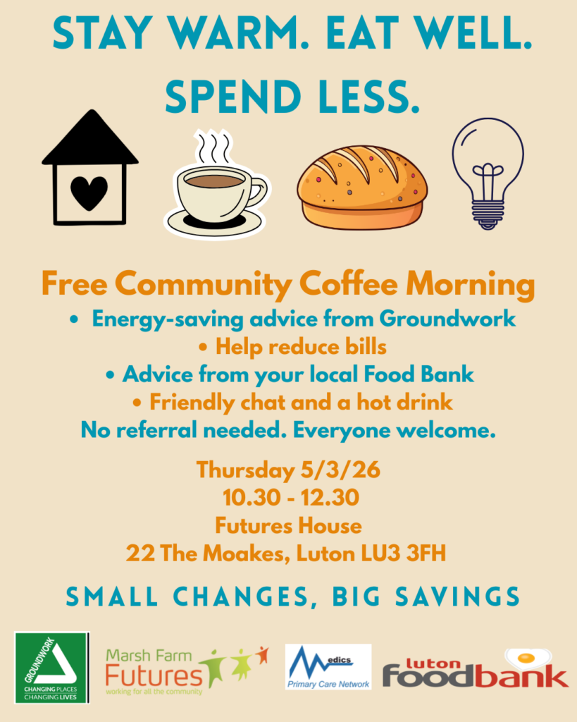 We are proud to partner with Groundwork, Marsh Farm Futures, and Luton Foodbank to invite you to a Free Community Coffee Morning.